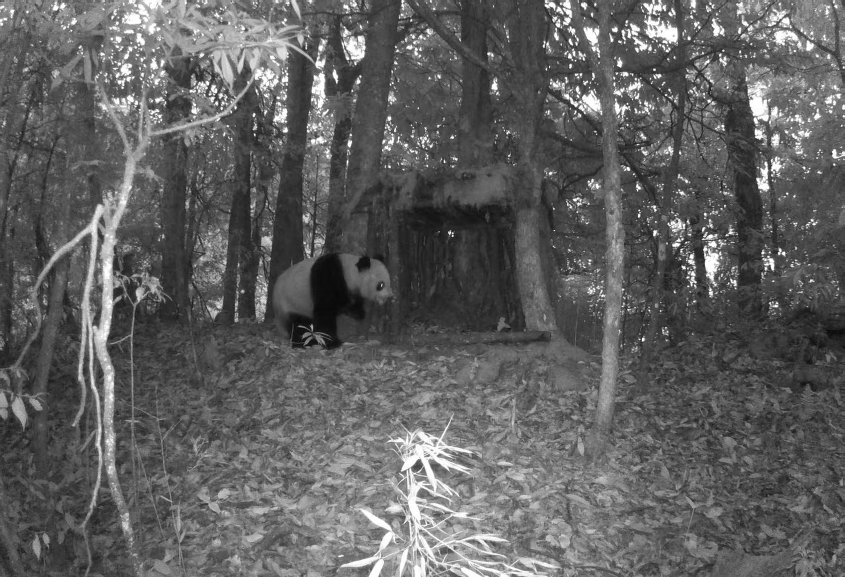 在尹选鸿的电脑里,珍藏着一组珍贵的照片:一只野生大熊猫在人工搭建的巢穴附近悠闲活动,胖乎乎的身影在镜头前格外惹人喜爱。