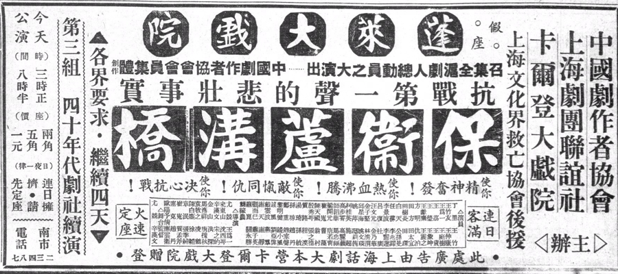 《保卫卢沟桥》的创作与排演,在历史的书页中飞快翻过,更多的剧目与抗战实践纷繁涌动,汇聚成坚毅而闪亮的抗战史。正如徐煜所说:“上海是戏剧创作高地,可以说之后的抗敌演剧队中的主心骨还是这批救亡者。”夏衍在1940年回顾三年来的戏剧抗战时曾言,“在千万年轻的文化戏剧工作者的队伍里面,我们确信,记录新中国之受难与成长的无数的不朽的作品,无数有着伟大将来的作者,已经在胎动中了。”
