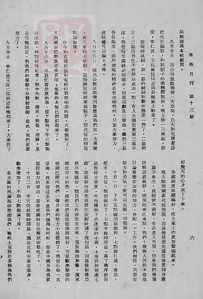 《华西月刊》1937年第13期,陈叔亮(陈朗)所写《自排演到公演》文章片段。(资料图片)