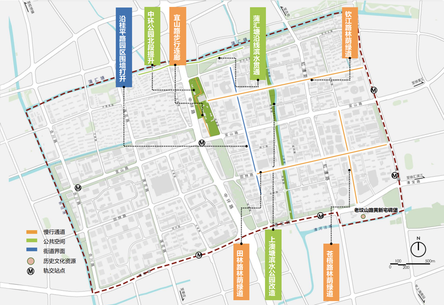 根据公示方案,漕河泾重点在公共空间营造上投入,如建设步行连廊与林荫绿道结合的慢行系统,重点提升宜山路等道路步行体验,提供便捷舒适的慢行空间。通过围墙打开、释放内部绿地,打造人人就近可享的高品质公园。链接区域水系,打通滨水堵点,加快重点滨水空间改造。