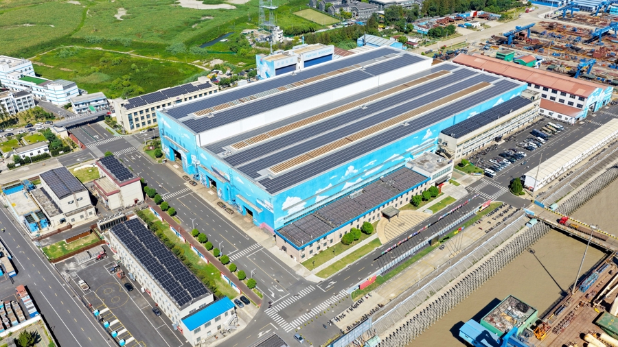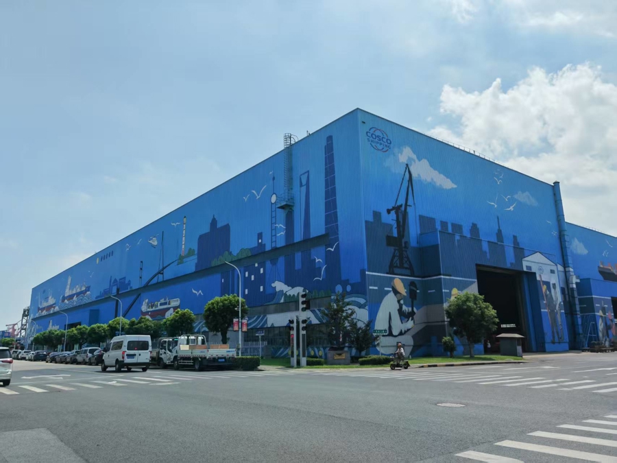 “这面‘大海蓝’色的厂房外墙很漂亮吧?以前这里不是这样的,白色外墙上涂着公司名字、生产标语等,‘颜值’和现在比,差了一大截。”带着记者走在厂区里,姚笑兴奋地打开了话匣子。眼前的船体车间外墙以蓝色为基底,画着大桥、轮船、海鸥、海浪等景物,让人心旷神怡。