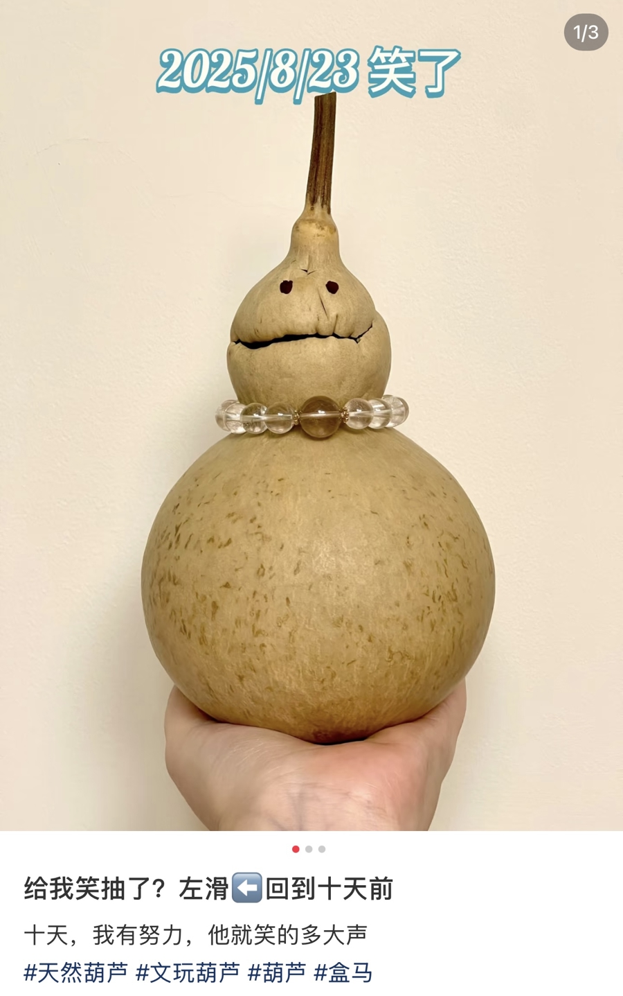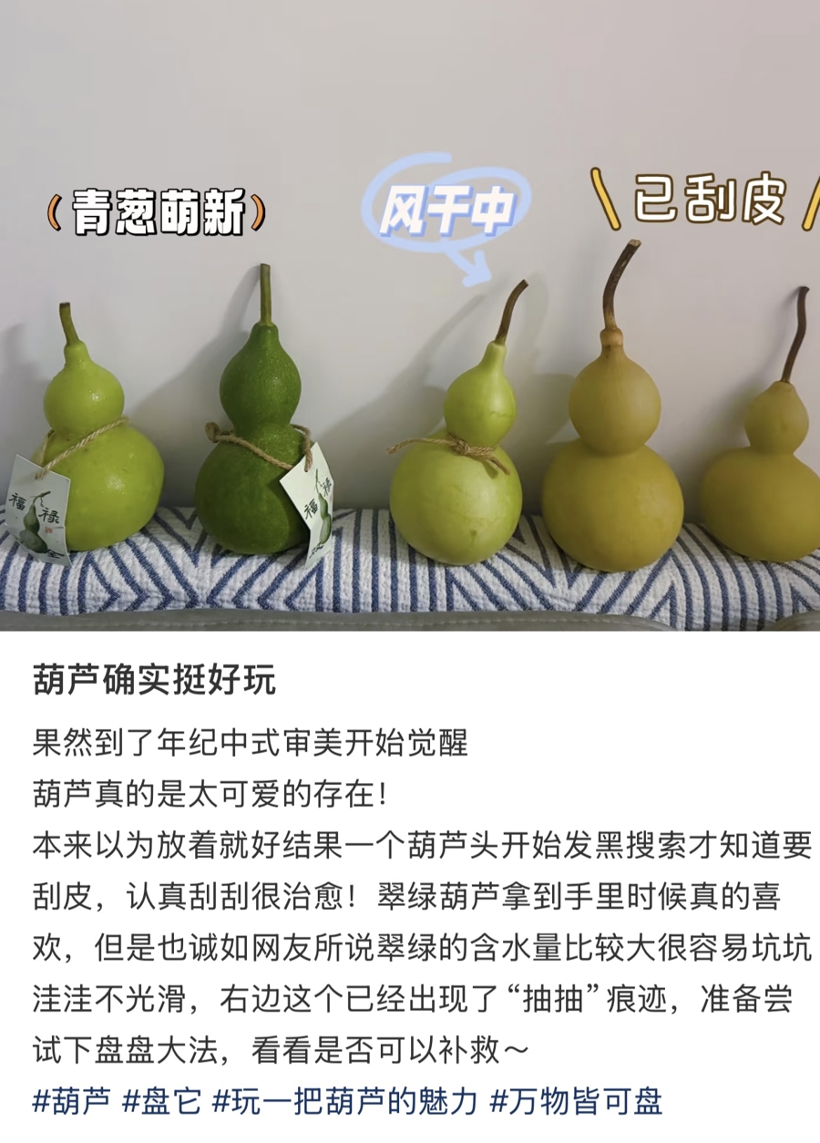 “十几块钱承包整晚的快乐”“认真打皮,真的很治愈”“中式审美觉醒”……在小红书上搜索“葫芦”,各类分享帖、科普帖层出不穷,围观者更是不少。